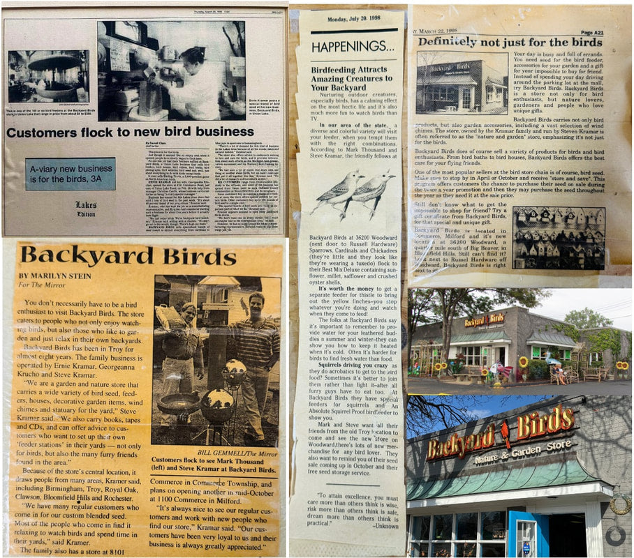 Our story begins in late 80s, when Ernie Kramar opened a store in Commerce to sell specialized blends of seed meant to attract all popular Michigan backyard birds from cardinals to bluejays to sparrows to hummingbirds. The original store was a true paradise for bird lovers, offering just about everything to do with birds but the birds themselves - and attracting incredible customers who are still loyal today. His son Steve continued the tradition, adding eclectic garden and metal decor that everyone driving on Woodward would immediately recognize. The legacy continues in present days with new ownership under the Caverly family, long time loving customers who are very grateful to take the story forward.